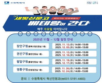 수원시가 매주 수요일 4개 구청을 순회하며 ‘새빛신문고 베테랑이 간다’를 운영한다.새빛신문고 베테랑이 간다는 현장에서 시민의 목소리를 듣고, 문제점이 있으면 해결책을 모색하는 찾아가는 민원 상담 서비스다.매주 수요일 진행되는 현장 상담에는 20년 이상 경력을 갖춘 베테