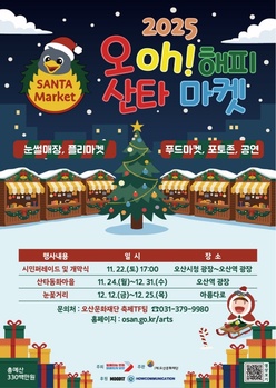 오산시가 주최하고 오산문화재단이 주관하는 겨울 대표 축제 ‘2025 오(Oh)! 해피산타마켓’이 오는 22일부터 12월31일까지 오산역광장과 아름다로상권 일대에서 개최된다.올해 축제는 오산시청을 출발해 롯데마트사거리–신양아파트사거리를 지나 오산역광장까지 이어지는 약 1