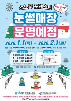 (재)평택시청소년재단 무봉산청소년수련원은 겨울철 대표 체험시설인 눈썰매장 ‘스노 포레스트’를 2026년 1월1일부터 2월1일까지 운영한다.당초 눈썰매장은 오는 24일 개장하기로 예정했으나 이상 기온의 지속 등 기상 여건을 고려해 일정을 조정했다.운영 시간은 매주 화~일