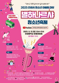 안성시 청소년들이 한자리에 모여 즐기고 교류하는 청소년 축제 한마당이 열린다.안성시는 오는 13일 오후 1시부터 오후 9시까지 안성중학교 운동장 일대에서 ‘2025 안성시청소년어울림마당-별하나르샤 청소년축제’를 개최한다.이번 축제는 청소년의 능동적·자주적 주인의식을 키