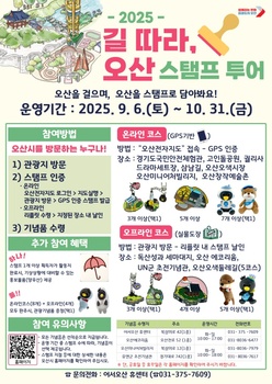 오산시는 가을철 관광객 유치를 위해 오는 6일부터 10월 31일까지 ‘길 따라, 오산’ 스탬프 투어를 운영한다.이번 프로그램은 오산시 주요 관광지와 역사·문화 자원을 둘러보며 지역의 매력을 체험할 수 있도록 기획됐으며 온·오프라인 방식으로 진행된다.특히 올해는 시민들의