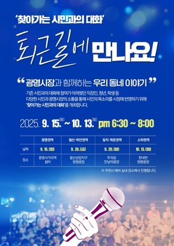 박승원 광명시장이 시민의 목소리를 시정에 반영하기 위해 퇴근길 현장소통에 나선다.광명시는 오는 15일부터 10월 13일까지 4회에 걸쳐 ‘2025년 찾아가는 시민과의 대화-퇴근길에 만나요’를 개최한다고 4일 밝혔다.시는 ‘시민과의 대화 및 동 방문’, ‘우리동네 시장실