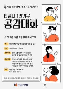 안성시는 오는 9일 오후 7시 안성맞춤문화살롱(안성맞춤아트홀 4층)에서 ‘안성시 1인가구 공감대화’를 개최한다.이번 행사는 1인가구 시민들의 생활 경험을 공유하고 현장의 정책 제안을 청취해 실효성 있는 지원정책을 마련하기 위해 기획됐다.공감대화는 △안성시 1인가구 주요