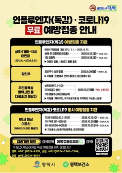 평택시는 오는 15일부터 ‘2025-26절기 코로나19 무료 예방접종’을 지정 위탁의료기관에서 실시한다.이번 접종은 65세 이상 어르신, 면역저하자, 감염 취약시설 입원·입소자를 대상으로 진행하며, 사업 초기 혼잡 방지와 안전사고 예방을 위해 대상별·연령별 순차적으로