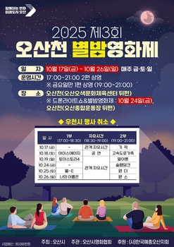 오산시는 오는 17일부터 26일까지 매주 금·토·일요일 오후 오산천(오색문화체육센터 뒤편)에서 ‘2025 제3회 오산천 별밤영화제’ 를 개최한다.오산천 별밤영화제는 가을밤 도심의 자연 속에서 영화를 즐길 수 있는 야외 상영 행사로, 이번에는 남녀노소 누구나 즐길 수 있