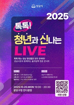 성남시는 청년세대와 소통 강화를 위해 '톡톡! 청년과 신나는 LIVE'를 오는 20일 오후 7시부터 8시30분까지 분당구청 앞 잔디광장에서 개최한다.행사는 성남시에 거주하거나 활동하는 19~39세 청년을 대상으로 진행하며, 성남시 공식 유튜브 채널 ‘성남TV’를 통해