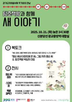 경기콘텐츠진흥원은 느티나무재단과 함께 오는 21일 오후 3시30분부터 오후 5시까지 신분당선 광교중앙역 지하철 서재에서 ‘탐조책방과 함께 새 이야기’ 북토크를 연다.북토크에는 KBS 다큐멘터리 ‘울 엄마 맹순 씨의 새들처럼’의 실제 주인공이자 ‘맹순 씨의 아파트에 온