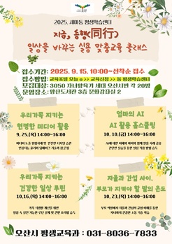 오산시가 오는 23일부터 10월 24일까지 양산도서관, 소리울도서관, 남촌동 행복온커뮤니티센터에서 ‘지금, 동행(同行) – 일상을 바꾸는 실용 맞춤교육 클래스’를 운영한다.이번 프로그램은 지역별 인구 구조와 생활 특성을 고려한 맞춤형 평생학습으로, 시민들이 가까운 생활