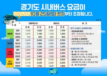 경기도가 도내 버스업계 경영 상황을 개선하고 안정적인 대중교통 서비스 제공을 위해 25일 첫차부터 시내버스 요금을 조정한다.22일 경기도에 따르면 도의 시내버스 요금 조정은 2019년 9월 이후 6년 만으로 일반형·좌석형은 각 200원, 직행좌석형·경기순환형은 각 40
