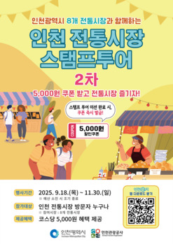 인천시와 인천관광공사는 오는 11월 말 까지 ‘2025년 제2차 인천 전통시장 모바일 스탬프투어’를 개최한다고 18일 밝혔다.앞서 진행된 제1차 스탬프투어는 높은 호응으로 준비된 쿠폰이 조기 소진되며 한 달 만에 조기 종료됐다.이 행사에는 외국인을 포함한 8800여 명