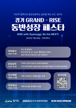 경기도형 지·산·학 협력 플랫폼이 본격적으로 출범한다.경기도·경기도경제과학진흥원·경기도RISE대학협의회는 오는 26일 연성대학교 연곡문화센터에서 '경기 GRAND-RISE 동반성장 페스타'를 개최한다.행사는 경기도가 추진하는 '지역혁신중심대학지원체계(RISE)'사업의