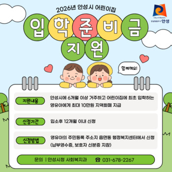 안성시는 2026년부터 어린이집 입학준비금 지원사업을 새롭게 시행한다. 사업은 어린이집을 이용하는 영·유아가정의 양육비 부담을 덜고 보육의 공공성을 강화하기 위한 것으로, 관내 어린이집에 최초로 입소하는 영 ·유아를 대상으로 지원한다.입학준비금은 영·유아가 어