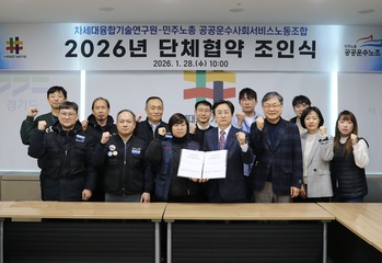 경기도·서울대학교 공동출연법인 차세대융합기술연구원은 기술 융합에 이어 노사 교섭에서도 융합에 성공했다.융기원은 28일 민주노총 공공운수노동조합과 '2026년 단체협약 조인식'을 체결했다.조인식에는 배수문 융기원 부원장과 이선명 민주노총 경기지역지부장, 안웅섭 융기원 노