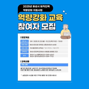 화성특례시는 퇴직 인력의 사회 재진출과 안정적 노후 준비를 돕기 위한 ‘역량 강화교육’ 5기 참여자를 모집한다.교육은 ‘2025년 화성시 퇴직 인력 역량 강화 지원사업 : 신중년 점프업 프로젝트’의 일환으로 마련됐다. 주요 과정은 △활기찬 중년으로 살아가기 △
