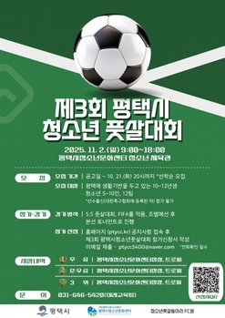 평택시와 평택시청소년문화센터는 오는 11월2일 평택시청소년문화센터 청소년체육관에서 열리는 ‘제3회 평택시 청소년풋살대회’ 참가 팀을 오는 10월21일까지 모집한다.대회는 청소년들에게 건전한 여가활동을 제공하고 스포츠를 통한 협동심과 건강한 경쟁문화를 조성하기 위해 마련