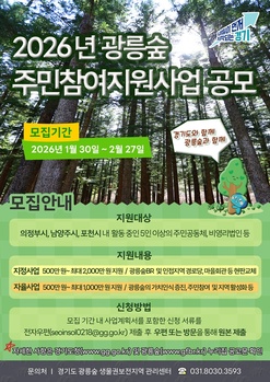 경기도가 광릉숲 생물권보전지역 활성화를 위해 2026년 광릉숲 주민참여지원사업 참여자를 모집한다.30일 경기도에 따르면 광릉숲 생물권보전지역 주민참여지원사업은 의정부시, 남양주시, 포천시 내에서 활동하고 있는 5인 이상의 주민공동체, 비영리법인 등을 지원하는 지역 활성
