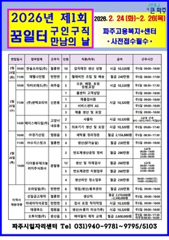 파주시는 지역 내 구직자와 구인기업 간 실질적 취업·채용 기회를 제공하고 지역 고용 활성화를 도모하기 위해 2026년 제1회 ‘구인·구직 만남의 날’을 오는 2월24일부터 26일까지 3일간 파주고용복지플러스센터(금촌동 엠에이치(MH)타워 8층)에서 개최한다.행사에서는