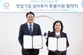 안양시는 IBK기업은행과 손잡고 기업의 설비투자를 돕는다.안양시는 11일 IBK기업은행과 지역 내 창업기업의 설비투자 지원을 위해 '창업기업 설비투자 특별지원' 업무협약을 체결했다.시청에서 열린 협약식에는 최대호 안양시장과 김상희 IBK기업은행 CIB그룹 부행장을 비롯