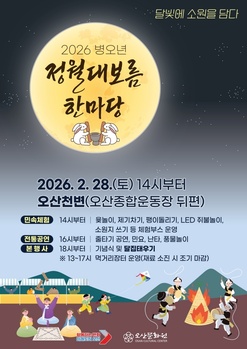 오산시는 오는 28일 오후 2시부터 오산천 일원(오산종합운동장 뒤편)에서 시민과 함께하는 ‘병오년 정월대보름한마당’을 개최한다.행사는 정월대보름을 맞아 시민들과 함께 한 해의 건강과 안녕을 기원하고 전통문화를 계승하기 위해 마련됐다.‘달빛에 소원을 담다’를 주제로 열리