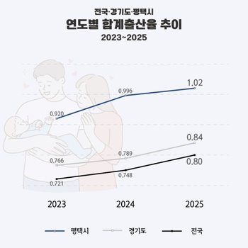 평택시의 합계출산율이 1.02를 기록하며 2년 연속 상승세를 보였다. 국가데이터처가 발표한 2025년 잠정 합계출산율에서 평택시는 2024년 0.996에서 2025년 1.02로 상승하며 1.0명을 넘어섰다. 이는 2023년 0.92명 이후 2년 연속 상승이다.