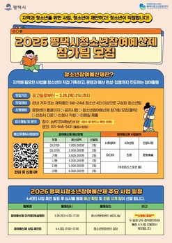평택시청소년문화센터는 청소년들의 주도적 참여로 이루어지는 ‘평택시청소년참여예산제’ 참가 팀을 모집한다.평택시청소년참여예산제는 지역사회에 필요한 사업을 청소년이 스스로 발굴하고 예산 편성부터 운영까지 전 과정을 주도적으로 수행하는 참여활동이다. 이를 통해 청소년이 지역사