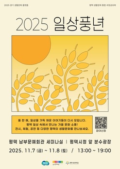 (재)평택시문화재단은 오는 7일부터 8일까지 평택 남부문화예술회관 세미나실과 평택시청 앞 분수광장 일대에서 생활문화 통합공유회 ‘2025 일상풍년’을 개최한다.이번 행사는 한 해 동안 추진된 평택의 주요 생활문화 사업을 한자리에 모아 그 성과를 공유하고 생활문화 활동가