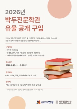 안성 박두진문학관은 전시·교육 및 연구자료로 활용할 박두진 관련 유물과 안성 출신 문인 관련 유물을 공개 구입한다.주요 구입 대상은 박두진(朴斗鎭, 1916~1998)의 작품이 수록된 도서 원본을 비롯해 친필 글씨와 유품 등으로, 한국 현대시를 대표하는 박두진 시인의