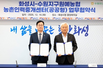화성특례시는 지난 16일 수원지구원예농협과 ‘농촌인력중개센터(공공형) 운영을 위한 업무협약(MOU)’을 체결하고 공공형 계절근로사업을 처음 추진하기로 했다.화성시청에서 열린 협약식에는 정명근 화성시장과 이용학 수원지구원예농협 조합장을 비롯한 관계자들이 참석해 공공형 농