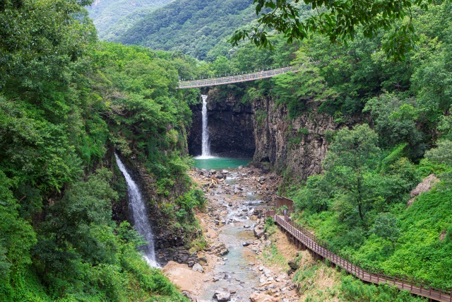 주상절리 지형의 주변 풍경 역시 장관이다. 절벽 위에서 떨어지는 물줄기는 마치 자연이 연출한 거대한 극장 같고 바위 아래 검푸른 소는 깊고 푸르다. 낙차 때 바람을 타고 공중에서 하얗게 흩어지는 물방울들도 시원하기 그지없다. 비가 내린 다음 날은 물줄기가 더욱 강해진다.